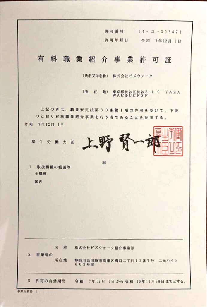 | 有料職業紹介 許可番号 | 14 – ユ – 302471 |